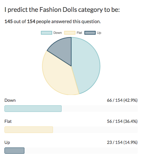 Respondents were lacking in enthusiasm about the prospects for fashion dolls this year. On 15% thought the category would be up.