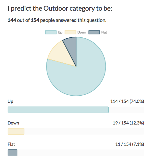 Only 14% think this category will be up. The Dies Cast category is dominated by inexpensive, metal toy cars. The low price makes them an impulse item. With fewer people going to the store, there are fewer people to be enticed. Blame e-commerce.
