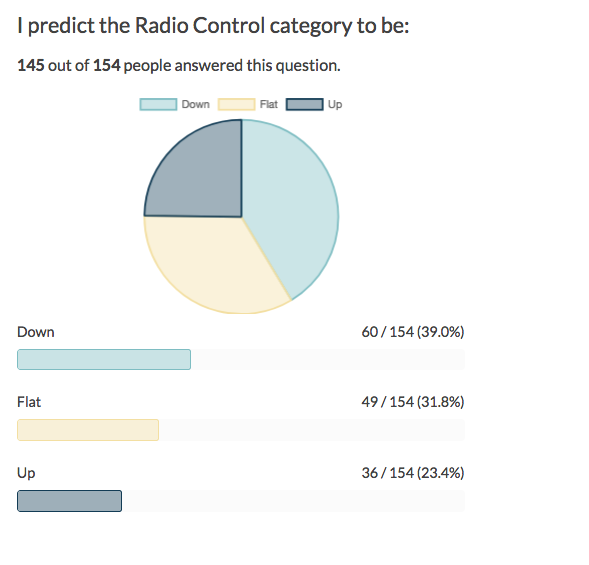 Respondents were flat in their estimation of this category. Only 23% think R/C will be up this year. Could the cause be that the products are perfect for outdoor play but don’t demand as much activity?