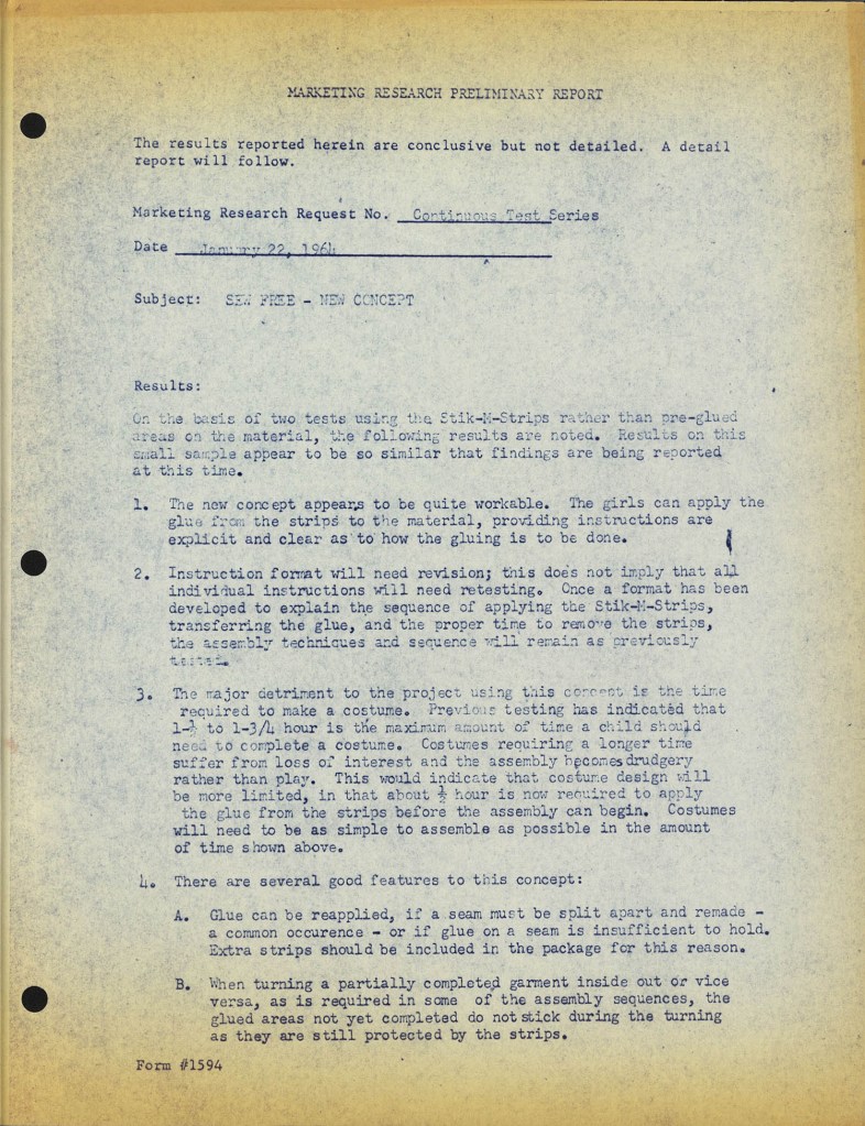 Mr. Handler thought that children would like to make clothes for Barbie themselves in addition to buying her ready-to-wear fashions. The scissors and needles needed for traditional sewing were problematic. How could Mattel make sewing for Barbie safe and simple? Sew-Free, the resulting product, had Spencer’s patterns hand-painted onto cotton fabric that could be cut with children’s safety scissors and assembled with innovative glue strips. Spencer would go on to design 12 patterns for the Sew-Free line over the next two years—and her hands appeared in the booklet that accompanied the Sew-Free kits!