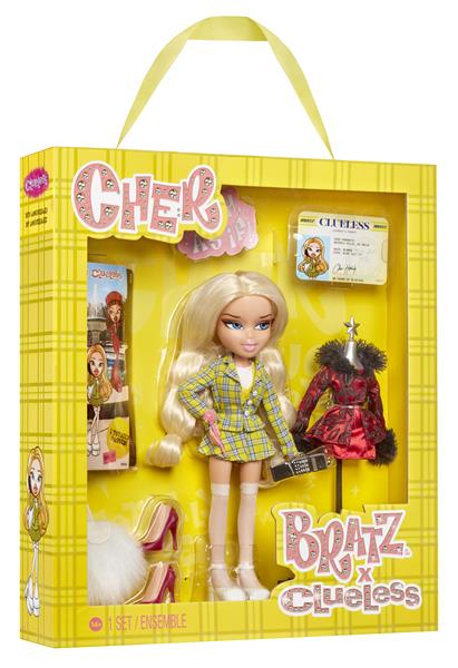 - Cher Bratz Doll: Kicking off the collection on July 17, Cher arrives in her most recognizable look: the striking yellow plaid co-ord set complete with thigh-high stockings, a white fuzzy backpack, and her signature silky blonde hair. Her second ensemble is the memorable red party dress (the one she famously refused to get on the ground for!), paired with a matching feather-trimmed jacquard jacket and pointed-toe pumps.